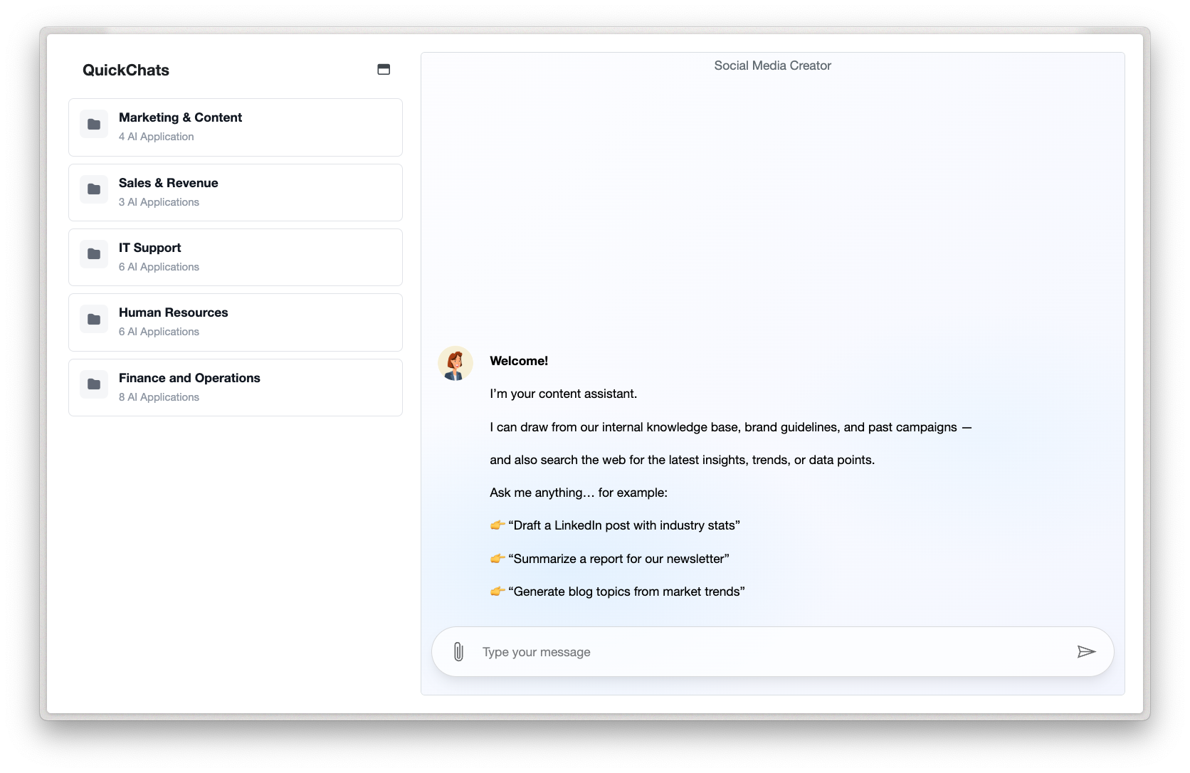 Marketing gets content creators, Sales gets prospect researchers, Support gets troubleshooters–all powered by your company's knowledge base and data.